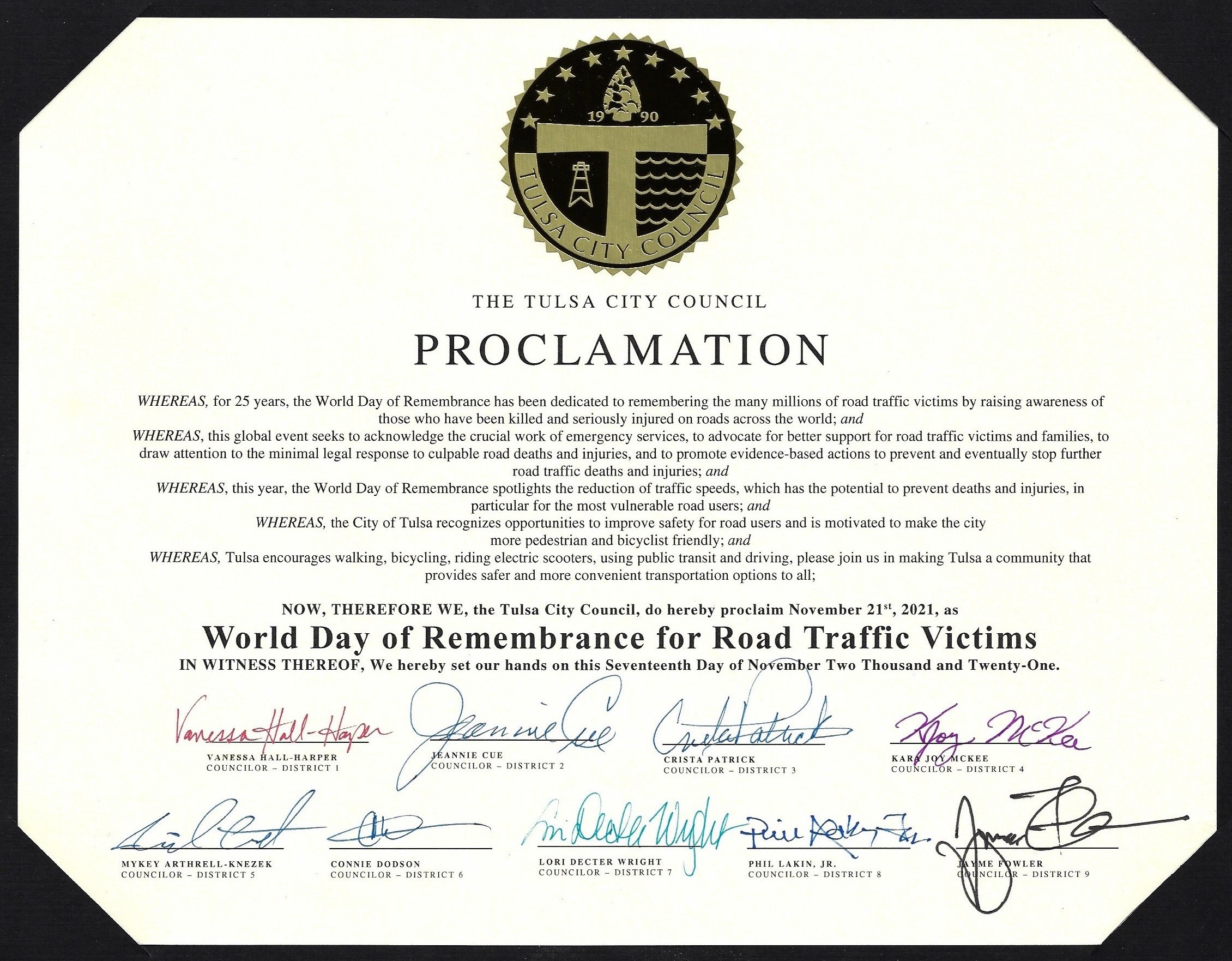 NOW, THEREFORE WE, the Tulsa City Council, do hereby proclaim November 21st, 2021, as World Day of Remembrance for Road Traffic Victims