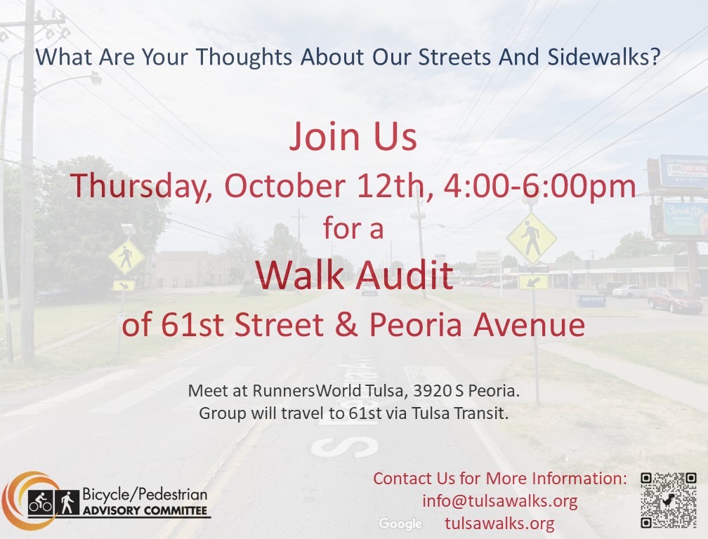 The Tulsa Bicycle and Pedestrian Advisory Committee is hosting a series of Walk Audits across our great city. Please check this page and our Facebook page for upcoming events in your area.